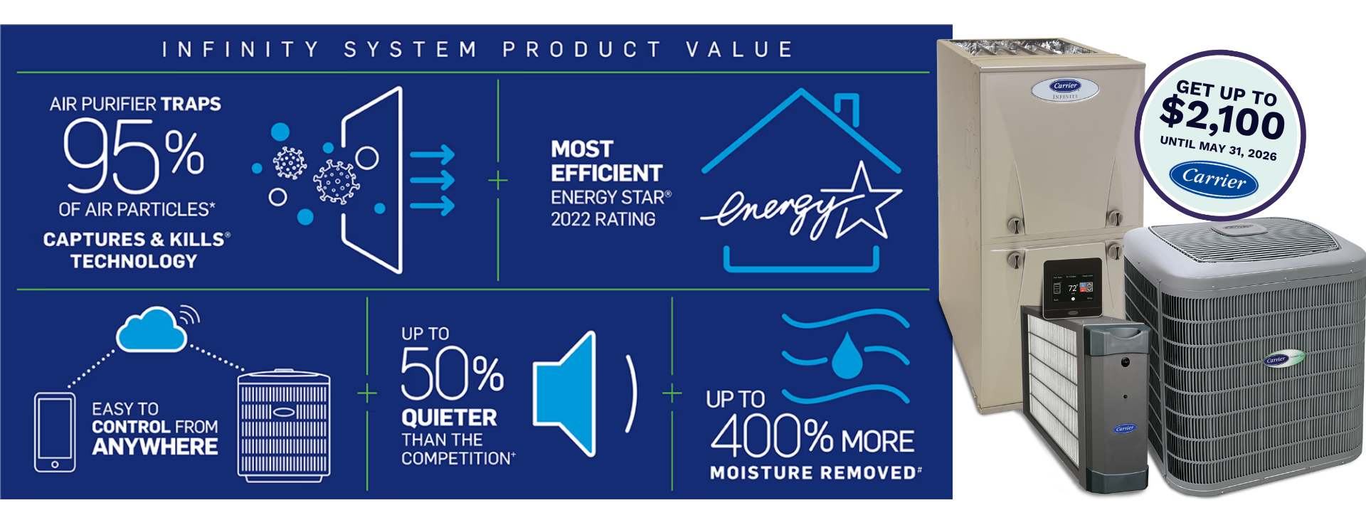 The Carrier Infinity® system is the pinnacle of home comfort technology. Smart, connected, and energy-efficient, it delivers precise control over your indoor environment while helping reduce energy costs. By minimizing temperature swings and eliminating hot and cold spots, Infinity® creates consistent, year-round comfort. It’s the perfect blend of Carrier innovation and expertise – designed to keep your home comfortable with ease.